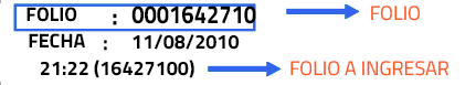 Estimado Usuario a continuación se muestra el folio que debe ingresar al generar su factura